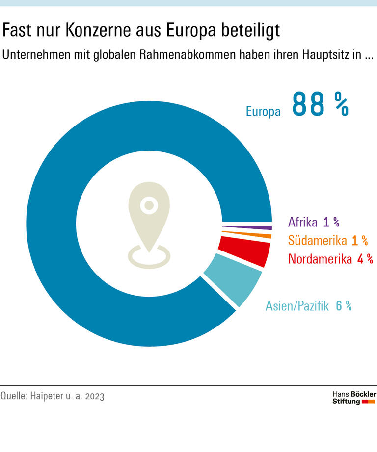 Globale Rahmenvereinbarungen werden zwischen dem Management eines multinationalen Unternehmens auf der einen Seite und auf der anderen Seite internationalen Gewerkschaftsverbänden wie IndustriALL oder UNIGlobalUnion sowie Branchengewerkschaften geschlossen. Sie legen konzernweit Mindeststandards für Arbeitsbedingungen fest und definieren Verfahren zur Umsetzung. Seit Ende der 1980er-Jahre wurden 185 solcher Verträge in 124 Unternehmen abgeschlossen, von denen derzeit 132 in Kraft sind. Fast 90 Prozent wurden mit Unternehmen vereinbart, die ihren Sitz in Europa haben. Viele dieser Abschlüsse stammen aus den frühen 2010er-Jahren. Auf den ersten Blick erscheint die Zahl angesichts der Vielzahl global agierender Unternehmen gering. Hinzu kommt, dass die Vereinbarungen freiwillig und jederzeit kündbar sind. Es gibt keine Instanz, bei der Verstöße eingeklagt werden können. Die globalen Abkommen stellen daher auch keinen Ersatz für Tarifverträge dar, sondern können allenfalls einen allgemeinen Rahmen bieten. Und trotzdem haben sie eine wichtige Funktion „als wegweisende Modelle einer transnationalen Arbeitsregulierung“, so die Forschenden. Zum Beispiel in Ländern, in denen kollektive Tarifverhandlungen nicht so wie in Deutschland und vielen Ländern der EU möglich sind. Um die Umsetzung und Einhaltung der Vereinbarungen vor Ort kümmern sich verschiedene Akteure: die globalen Gewerkschaftsverbände, die im Unternehmen bereits bestehenden transnationalen Interessenvertretungen wie Europäische Betriebsräte oder Weltbetriebsräte sowie die nationalen Gewerkschaften und Betriebsräte am Stammsitz des Unternehmens.