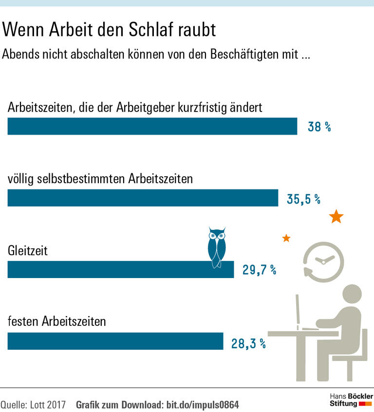 Bei völlig selbstbestimmten Arbeitszeiten fällt das Abschalten Arbeitnehmern schwerer als bei festen Zeiten. Interessanterweise ist dieser Effekt nur bei Männern zu beobachten. Die Wahrscheinlichkeit liegt bei 40 Prozent, dass sie abends nicht zur Ruhe kommen, elf Prozentpunkte mehr als bei Männern mit festen Arbeitszeiten. Dies führt die Forscherin darauf zurück, dass gerade Männer dazu neigen, ohne vorgegebene Grenzen übermäßig lange zu arbeiten. Frauen seien hingegen „typischerweise geübtere Grenzgängerinnen“ als Männer, so Lott. Sie nutzten die zeitliche Flexibilität statt für unzählige Überstunden eher, um Haus- und Sorgearbeit mit dem Job unter einen Hut zu bringen.