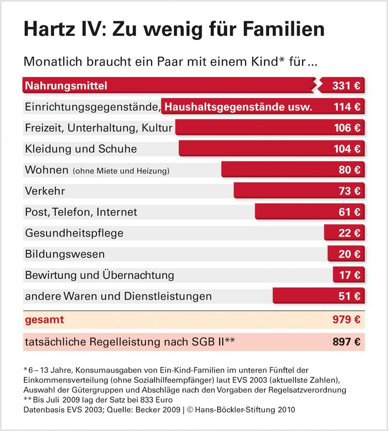 Das höchste deutsche Gericht befasst sich mit der Frage, ob die Hartz-IV-Leistungen für Kinder ausreichen, um ihr soziokulturelles Existenzminimum zu sichern. Eine Studie der Volkswirtin Irene Becker im Auftrag von Hans-Böckler-Stiftung und Caritasverband kam schon 2007 zu dem Schluss, dass Familien mit Kindern in der Grundsicherung zu kurz kommen. Das liegt an diversen Mängeln bei der Bedarfsberechnung - nicht nur für Kinder, sondern auch für Erwachsene. Beckers - 2010 aktualisierte - Gegenrechnung zeigt, um wie viel die Leistungen für Paare mit einem Kind steigen müssten: Je nach Alter des Kindes ergibt sich ein Mehranspruch zwischen 70 und 82 Euro im Monat. Hinzu käme ein Ausgleich für die Preissteigerungen der vergangenen Jahre.