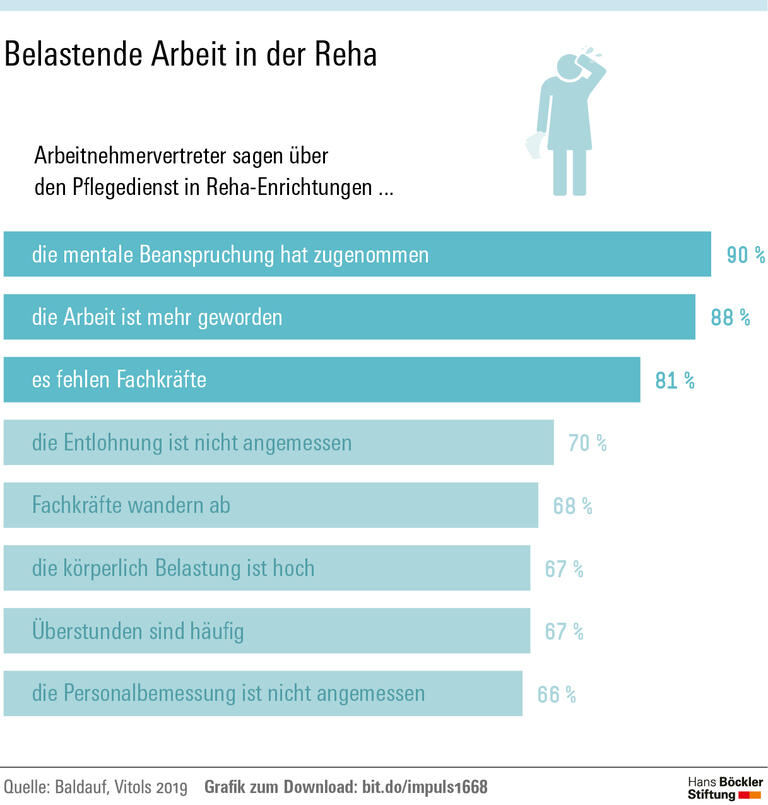 Die Zahl der Patienten ist zwar in den vergangenen Jahren nicht merklich gestiegen, doch ein entscheidender Faktor hat sich deutlich verändert, so Baldauf und Vitols: Reha-Einrichtungen haben es heute oft mit kränkeren und häufig auch älteren Patienten zu tun als in früheren Zeiten. „Eine verkürzte Verweildauer in Akutkrankenhäusern und Multimorbidität“ – Patienten haben mehrere Krankheiten gleichzeitig – führten zu „stark gestiegenen Schweregraden der Erkrankungen unter den Rehabilitanden“, so die Forscherinnen. So nimmt der Pflege- und Betreuungsbedarf zu. Da gleichzeitig das Beschäftigungsvolumen in der Branche – umgerechnet auf Vollzeitstellen – stagniert, hat sich die Arbeitsbelastung der Beschäftigten erhöht. Die Alterung der Bevölkerung und die wachsende Zahl von Patienten mit psychischen Krankheiten dürften diese Entwicklung in Zukunft noch beschleunigen. Hinzu kämen neue Anforderungen durch die Digitalisierung, die zunächst einmal Mehrarbeit und Schulungsbedarf bedeuten.