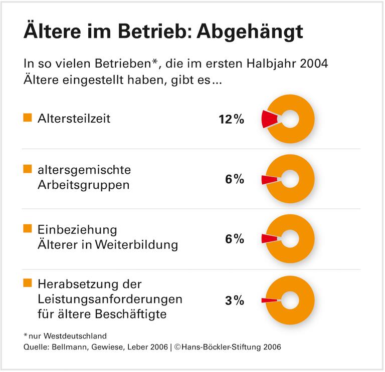 Ältere Skandinavier können lange im Job fleißig bleiben. In Dänemark gingen 2004 laut Eurostat 60 Prozent der 55- bis 64-Jährigen arbeiten, in Schweden gar 70 Prozent. Der Durchschnitt in den OECD-Ländern lag bei 50,8 Prozent. Werte, von denen Deutschland weit entfernt ist: Hier hatten 2004 nur 41,8 Prozent dieser Altersgruppe einen Job. Das sind zwar vier Prozentpunkte mehr als 1996, doch der Trend müsste sich erheblich verstärken, um das vom Europäischen Rat vorgegebene Ziel zu erreichen - danach soll bis 2010 jeder zweiter Europäer zwischen 55 und 65 im Berufsleben stehen. "Die unterproportionale Beschäftigung Älterer erklärt sich wesentlich aus dem betrieblichen Umgang mit den Angehörigen dieser Beschäftigtengruppe", so eine Studie des Instituts für Arbeitsmarkt- und Berufsforschung (IAB). Lutz Bellmann, Tilo Gewiese und Ute Leber haben - finanziert von der Hans-Böckler-Stiftung - die IAB-Betriebspanel von 2002 und 2004 ausgewertet, um das Problem aus Sicht der Arbeitgeber zu analysieren. Das Panel basiert auf Befragungen in fast 16.000 Betrieben aller Größen und Branchen.