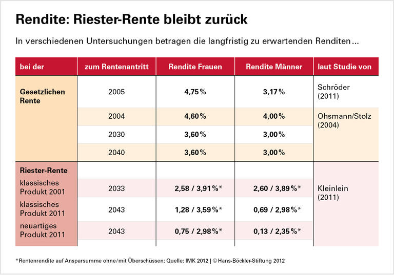 Renditen niedriger als in der Gesetzlichen Rentenversicherung. Anders als noch in den 1990er-Jahren oft behauptet, weisen kapitalgedeckte Vorsorgeformen nach der Analyse der Forscher keine überlegenen Renditen auf. Die systematischen Renditevergleiche, die Wissenschaftler bislang zwischen gesetzlicher Rente und kapitalgedeckten Zusatzversicherungen anstellten, prognostizierten langfristig ähnliche oder sogar etwas höhere Renditen für das gesetzliche System. Aktuell sei für alle Formen von kapitalgedeckten Lebens- und Rentenversicherungen ein deutlicher Renditerückgang zu beobachten. Bei Riester-Rentenverträgen sank der Garantiezins zwischen 2002 und 2012 von 3,25 auf 1,75 Prozent. Eine Untersuchung des Deutschen Instituts für Wirtschaftsforschung (DIW) gelangte zu dem Ergebnis, dass bei 2011 neu abgeschlossenen Verträgen die Versicherten mindestens 87 Jahre alt werden müssten, um wenigstens ihre eigenen Einzahlungen und die staatlichen Zulagen wieder ausgezahlt zu bekommen – ohne jegliche Rendite. Hinzu komme, dass Risiken wie Erwerbsunfähigkeit, die früher über die gesetzliche Rentenversicherung abgesichert waren, nun zusätzlich versichert werden müssten.