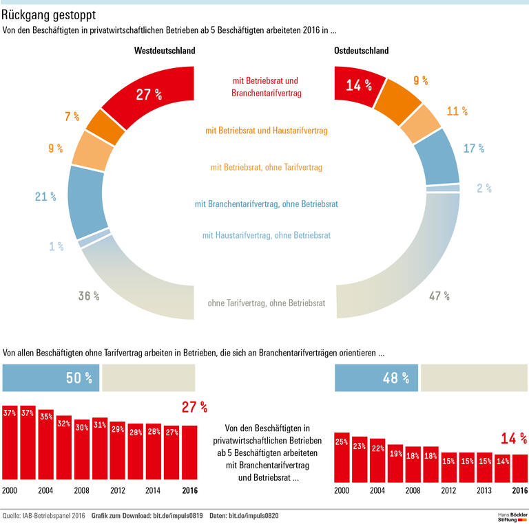 Peter Ellguth und Susanne Kohaut vom Institut für Arbeitsmarkt- und Berufsforschung (IAB) haben die Tarif- und Mitbestimmungslandschaft in Deutschland neu vermessen. Dafür haben sie Daten des IAB-Betriebspanels ausgewertet. Nach ihren Berechnungen, die sich auf private Betriebe mit mindestens fünf Mitarbeitern beziehen, wurden im vergangenen Jahr 27 Prozent der westdeutschen und 14 Prozent der ostdeutschen Beschäftigten sowohl von einem Betriebsrat vertreten als auch nach Branchentarif bezahlt. Weder eine betriebliche Interessenvertretung noch einen tarifgebundenen Arbeitgeber hatten im Westen 36 Prozent und im Osten 47 Prozent der Arbeitnehmer. Die Hälfte der Beschäftigten in den Zonen ohne Tarifbindung profitiert aber davon, dass sich ihr Arbeitgeber an einem Flächentarif orientiert. Seit Mitte der 1990er-Jahre sei die „Kernzone des dualen Systems der Interessenvertretung“ erheblich geschrumpft, schreiben die Wissenschaftler. Immerhin habe sich der Rückgang zuletzt aber nicht fortgesetzt. Der Anteil der Beschäftigten mit Betriebsrat hat 2016 gegenüber dem Vorjahr sogar leicht zugelegt, um jeweils einen Prozentpunkt in West und Ost. Ob damit eine Trendwende erreicht ist, müsse die weitere Entwicklung zeigen.