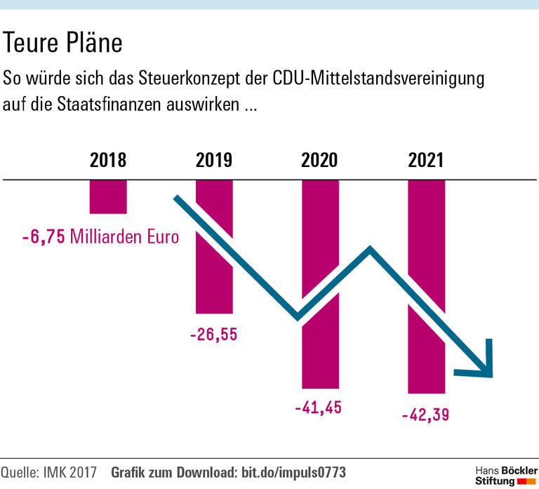 Dieses Risiko sehen sie mit Blick auf derzeit kursierende Vorschläge für umfangreiche Steuersenkungen. Die Wissenschaftler haben durchkalkuliert, welche Folgen das Steuerkonzept der CDU-Mittelstandsvereinigung – der aktuell konkreteste Vorschlag – und eine Abschaffung des Solidaritätszuschlages für die Staatsfinanzen hätten. Den Berechnungen zufolge würde das CDU-Konzept im kommenden Jahr staatliche Mindereinnahmen von knapp 7 Milliarden Euro verursachen, 2021 wären es gut 42 Milliarden. Eine Abschaffung des Solidaritätszuschlages würde 2021 mit weiteren 20 Milliarden Euro zu Buche schlagen.
