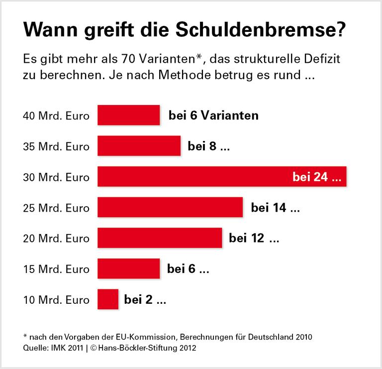 Sparzwang zur Unzeit. Als möglicherweise größtes Problem sehen die IMK-Forscher, dass die Schuldenbremse „in einer Situation erheblich unterfinanzierter öffentlicher Haushalte eingeführt wurde“. Denn Bund, Länder und Gemeinden seien seit vielen Jahren immer wieder durch Steuersenkungen erheblich belastet worden. Einen strukturell nahezu ausgeglichenen Haushalt zu verlangen, bedeute über Jahre hinaus eine strikte Sparpolitik – und gefährde so Wachstum und Beschäftigung.