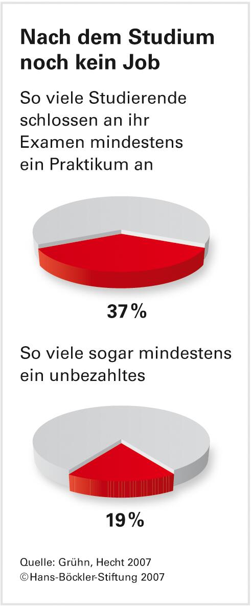 Sie sind jung, gut ausgebildet und motiviert - den Sprung auf einen Arbeitsplatz schaffen dennoch viele nicht auf Anhieb. 37 Prozent der Abgänger von Universitäten hängen darum nach dem Examen noch ein Praktikum an, 11 Prozent sogar ein zweites. Endlose Praktika-Schleifen sind aber die Ausnahme: Nur sechs Prozent der Absolventinnen machen mehr als zwei, bei Männern liegt diese Quote sogar bei Null. "Die in Medien gelegentlich suggerierte Vorstellung einer Generation von Dauerpraktikanten wird der Situation nicht gerecht", stellen Dieter Grühn und Heidemarie Hecht von der FU Berlin fest. Die Wissenschaftler haben im Auftrag der Hans-Böckler-Stiftung und des DGB prekäre Beschäftigungsformen von Hochschulabsolventen untersucht und erstmals empirische Daten erhoben. Bislang werteten sie über 500 Fragebögen von Akademikern aus, die an Hochschulen in Nordrhein-Westfalen oder Berlin ihr Studium abgeschlossen hatten.