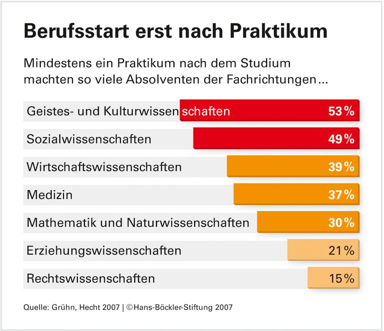 Die Sucharbeitslosigkeit beim Übergang in das Beschäftigungssystem hat sich verlängert, so die Forscher. Der Vergleich zwischen Absolventen des Wintersemesters 2002/2003 und denen des Jahres 2000 zeigt: Die Quote der Diplomierten oder Magister im Praktikum ist um 16 Prozentpunkte gestiegen. Praktikanten sind vor allem in Medien, Kultur und außerschulischer Bildung anzutreffen, seltener in der Wirtschaft. Und ihre Aufenthalte sind keine Stippvisiten: Die mittlere Dauer eines bezahlten Praktikums beträgt sechs Monate, 40 Prozent davon ziehen sich sogar noch länger hin. Unbezahlte Praktika sind im Schnitt einen Monat kürzer, aber jedes vierte erstreckt sich über mehr als ein halbes Jahr.