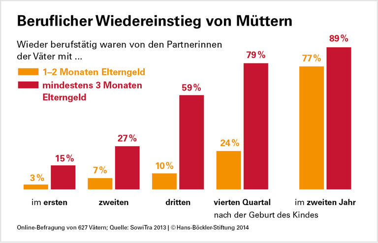 Dementsprechend unterschiedlich schnell kehrten auch die Mütter wieder in eine Erwerbstätigkeit zurück: Im vierten Quartal nach der Geburt ihres Kindes waren bereits 79 Prozent der Mütter wieder in ihren Beruf eingestiegen, deren Partner eine längere Auszeit nahmen. Wo der Partner nur für ein bis zwei Monate zu Hause blieb, kehrten nur 24 Prozent nach einem Jahr oder früher ins Berufsleben zurück.