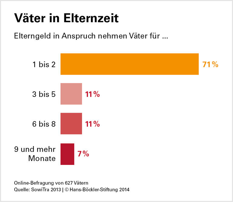 Die „stärker egalitär orientierten“ Väter – also diejenigen, die drei Monate oder länger Elterngeld beziehen – finden sich öfter bei Paaren, in denen beide Partner eine hohe Qualifikation aufweisen. Auch haben sie häufiger ein ähnlich hohes Einkommen und ähnlich lange Arbeitszeiten. Allerdings sind sie unter den männlichen Elterngeld-Empfängern nicht sehr oft anzutreffen: Hier machen sie 29 Prozent aus. Die 71 Prozent Elterngeld-Väter, die sich lediglich für die beiden Paarmonate entscheiden, verdienen häufiger mehr und arbeiten länger als ihre Partnerin.