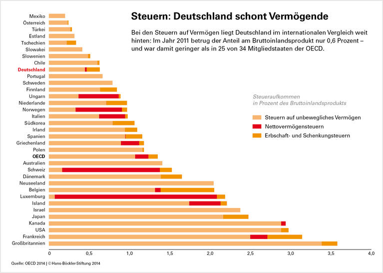 Das private Vermögen nimmt zu – und mit ihm die Ungleichheit. Darauf weist Brigitte Unger hin, die Wissenschaftliche Direktorin des WSI. Zugleich hätten Steuersenkungen die Staatsfinanzen stark strapaziert. So habe der deutsche Fiskus 2012 lediglich 24,3 Milliarden Euro aus vermögensbezogenen Steuern eingenommen, weniger als ein Prozent des Bruttoinlandsprodukts. Im internationalen Vergleich sei das ziemlich wenig (siehe auch Seite 6).