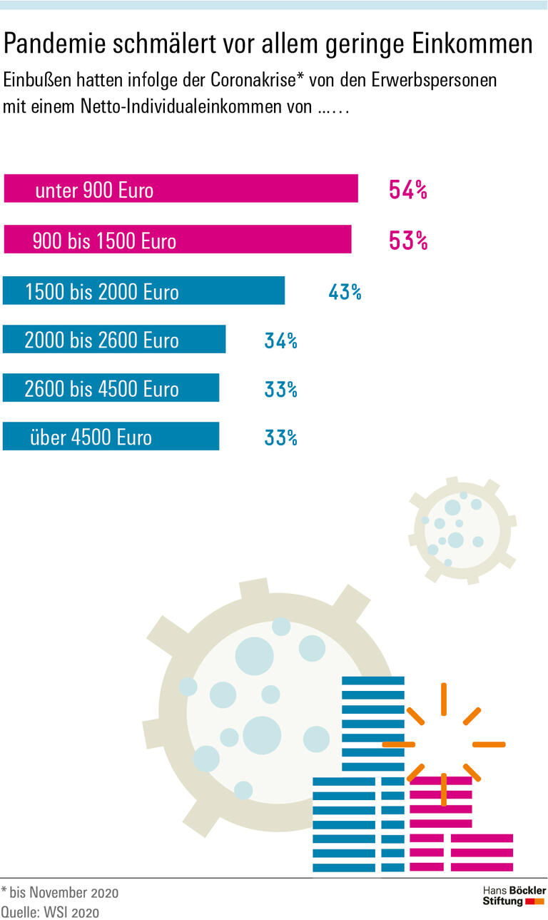 Parallel zum Aufflammen des Infektionsgeschehens und zum „Lockdown Light“ ist die Empfänglichkeit für Corona-Verschwörungsmythen in Deutschland deutlich zurückgegangen – um fast ein Drittel. Zugleich hat aber auch die Zufriedenheit mit dem Krisenmanagement der Bundesregierung in der Bevölkerung spürbar abgenommen. Neben der Angst, an Covid-19 zu erkranken, erreicht auch die Sorge um den gesellschaftlichen Zusammenhalt einen neuen Höchststand. Und das kommt nicht überraschend: Die Zahl der Erwerbspersonen, die durch die Pandemie Einkommensverluste erlitten haben, ist weiter gestiegen. Und besonders deutlich ist die Zunahme bei Erwerbstätigen mit bereits zuvor niedrigen Einkommen, die seltener von Sicherungsmechanismen am Arbeitsmarkt erfasst sind. Damit erhärten sich die Indizien für eine Zunahme der sozialen Ungleichheit im Zuge der Coronakrise, wie neue Ergebnisse aus der Erwerbspersonenbefragung der Hans-Böckler-Stiftung zeigen.