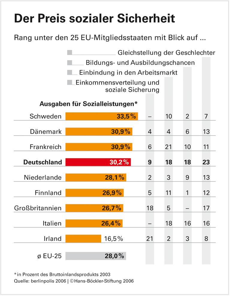 Die Deutschen rangieren zwar in punkto "Einkommensverteilung und soziale Absicherung", einer sozialpolitischen Kerndimension, noch unter den ersten zehn in der EU. Bei Arbeitslosigkeit und Bildungschancen, bei Geschlechtergleichstellung und demografischer Entwicklung landet die Bundesrepublik hingegen im unteren Drittel. Alles in allem setzt berlinpolis Deutschland auf Rang 23 unter den 25 Unionsstaaten. "Die Studie weist somit auch auf große Defizite im Hinblick auf eine nachhaltige Konsolidierung und Modernisierung des deutschen Sozialstaats hin", schreiben die Autoren Jeppe F. Jörgensen und Professor Jochen Schulz zur Wiesch.