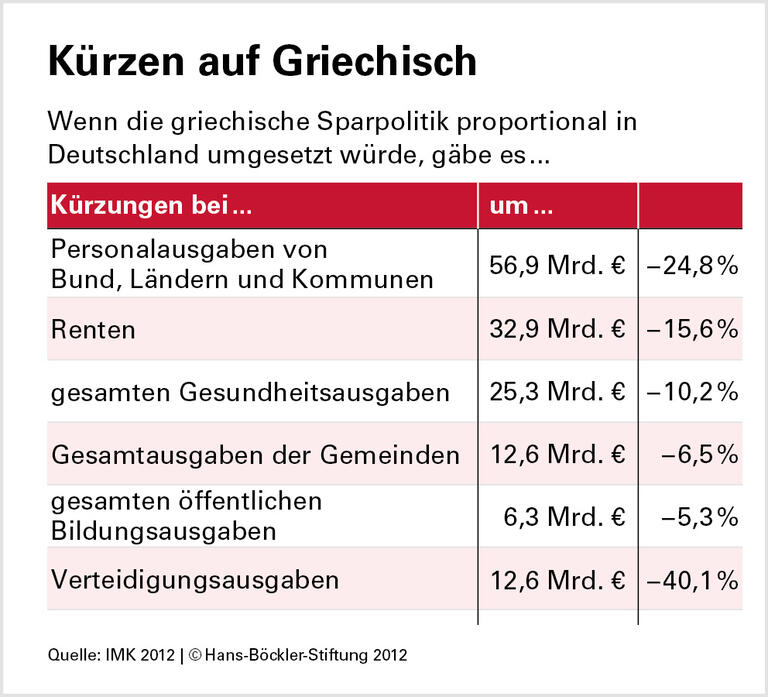 Wie massiv sich die Sparanstrengungen auswirken würden, verdeutlichen die Berechnungen von IMK-Forscher Fabian Lindner. Er hat die Kürzungsvorhaben der griechischen Regierung näherungsweise auf Deutschland übertragen: