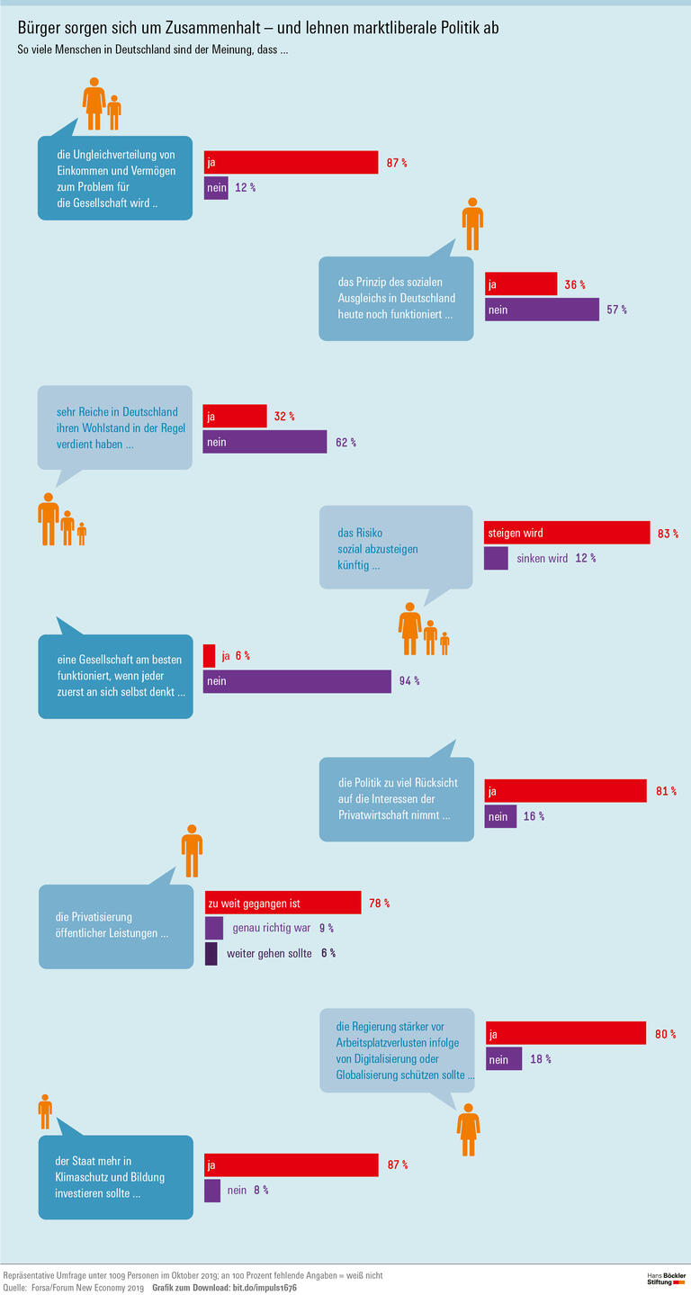 Die Ergebnisse lassen erkennen, dass sich die Menschen andere Antworten auf die Herausforderungen der Zeit wünschen. Eine Politik, die allein auf freie Märkte mit möglichst wenig Regulierung ausgerichtet ist, lehnen die meisten Deutschen ab: So sagen 78 Prozent der Befragten, dass die Privatisierung öffentlicher Leistungen in den vergangenen Jahrzehnten zu weit gegangen ist. Stattdessen befürworten viele ein stärkeres Eingreifen des Staates: 80 Prozent stimmen der Aussage zu, die Bundesregierung solle Beschäftigte schützen, wenn infolge der Digitalisierung oder Globalisierung in größerem Umfang Arbeitsplatzverluste drohen. Und 87 Prozent sind der Meinung, der Staat solle mehr Geld in Klimaschutz, moderne Schulen und Universitäten sowie die Bahn investieren.