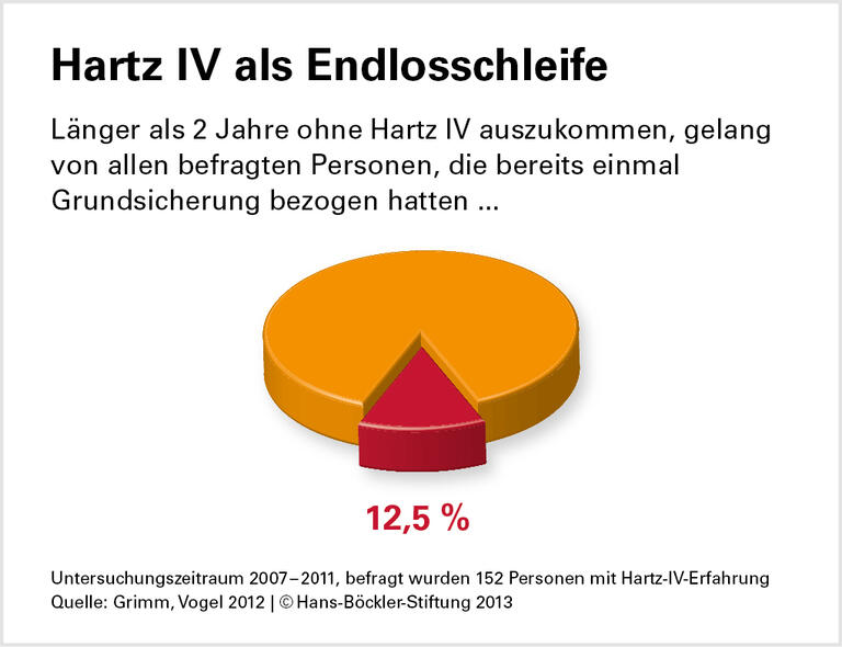 Rasender Stillstand. Im Untersuchungszeitraum von 2007 bis 2011 blieb lediglich ein Drittel der Interviewten ohne Kontakt zum ersten Arbeitsmarkt – die meisten in dieser Gruppe hatten aber phasenweise staatlich geförderte Jobs. Insgesamt zählte mehr als die Hälfte der Befragten zu den „erwerbsgesellschaftlichen Grenzgängern“, die zwischen Hartz IV und ungeförderter Beschäftigung hin- und herpendeln oder als Aufstocker sowohl Grundsicherung als auch ein niedriges Arbeitskommen beziehen. „Dieser Befund deckt sich auch mit den Arbeitsmarktzahlen.“ Die Erwerbsquote sei in den letzten Jahren deutlich gestiegen, allerdings hauptsächlich wegen der Zunahme atypischer Beschäftigung infolge der Arbeitsmarktderegulierung, so Grimm und Vogel.