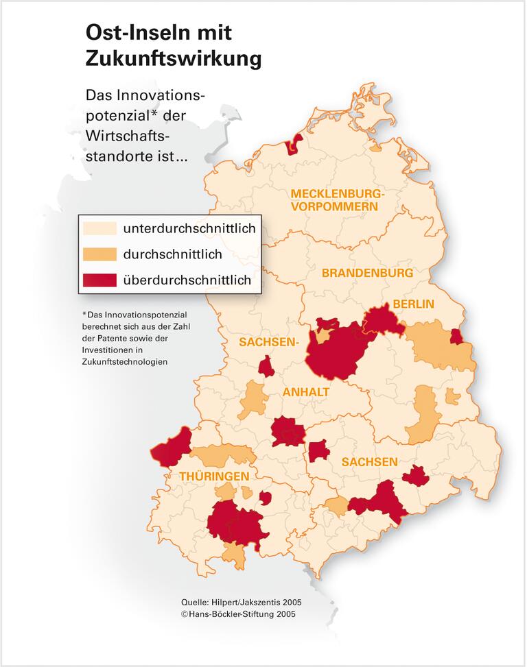 Bildung und Forschung: Starke Hochschulen sind für den Osten eine Schicksalsfrage. Wo es sie gibt, kann der Anschluss an globale Innovationszusammenhänge gelingen. Ingenieure, die von Universitäten und Fachhochschulen kommen, tragen innovative Ideen in die Unternehmen. Noch wirkungsvoller sind stabile Netzwerke zwischen Forschungseinrichtungen und Firmen, die für einen steten Wissenstransfer sorgen. Das OptoNet in Thüringen etwa übernimmt diese Aufgabe erfolgreich: Wissenschaftler speisen die Unternehmen regelmäßig mit Erkenntnissen, Ingenieure bilden sich fortwährend weiter. Unternehmer heben den Wert von Bildung hervor. An den erfolgreichen Orten heißt es: Ohne gute Leute habe der Standort keine Zukunft. In Thüringen führt jeder zweite Manager den Erfolg der Optikunternehmen auf die exzellenten Fachkräfte zurück. Die Forscher empfehlen, weiter in Köpfe zu investieren: in eine bessere Schulbildung, die auch Kenntnisse über die Berufswelt vermittelt. Sie raten, betriebliche Bildungsaktivitäten zu unterstützen - durch den Ausbau von Ausbildungsverbünden und Berufsakademien. Und schlagen vor, Hochschulen für die betriebliche Weiterbildung zu eröffnen. Eine lokale Wissensinfrastruktur sei gerade in strukturschwachen Regionen wichtig.
