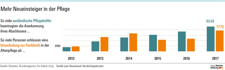 Klar ist: Der Personalmangel in der Pflege ist so groß, dass er sich allein mit Pflegekräften aus dem Ausland sowie Quereinsteigern, die aus anderen Berufen oder der Arbeitslosigkeit kommen, nicht lösen lassen wird. Aber immerhin sieht es so aus, als sei spürbare Entlastung unterwegs: Insgesamt haben zwischen 2012 und 2017 gut 30000 umgeschulte Fachkräfte ihre Ausbildung erfolgreich abgeschlossen, meist in der Altenpflege. Im gleichen Zeitraum haben rund 32000 Pflegekräfte aus dem Ausland die Anerkennung ihres Berufsabschlusses beantragt, davon allein 9000 im Jahr 2017. Bosnien-Herzegowina, Serbien und die Philippinen zählen zu den wichtigsten Herkunftsländern.
