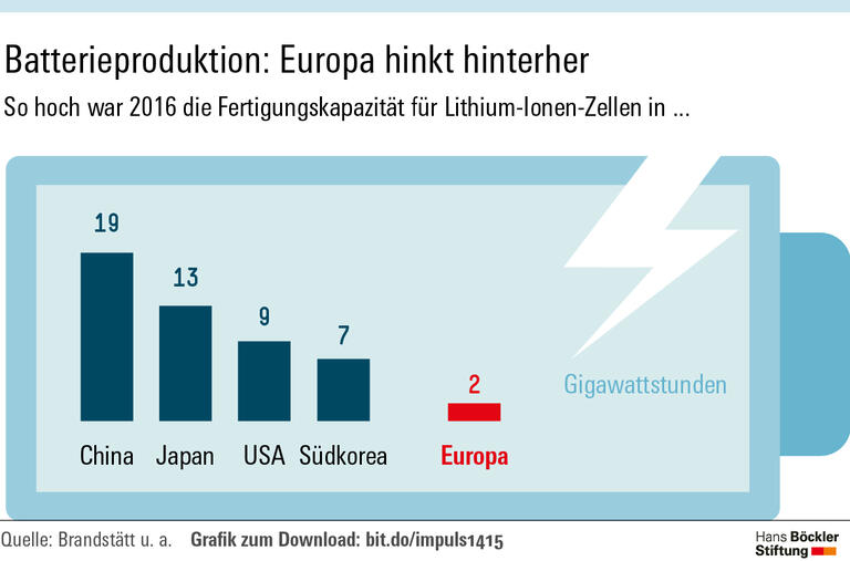 Noch sieht es in diesem Bereich eher mau aus: Batterien werden der Studie zufolge fast vollständig im Ausland produziert, vor allem in Asien. Bei Lithium-Ionen-Zellen lag 2016 die Produktionskapazität in ganz Europa bei 2 Gigawattstunden, in China bei 19, in Japan bei 13. Aktuell gebe es zwar Bestrebungen der hiesigen Industrie, eine konkurrenzfähige Batteriefertigung in Deutschland und Europa aufzubauen. Doch da sei noch viel zu tun: „Die Zahlen verdeutlichen, dass es massiver Anstrengungen der deutschen Wirtschaft bedarf, wenn Unternehmen in Deutschland von den Beschäftigungseffekten zukünftig profitieren wollen.“