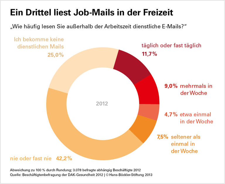 Die Autoren, Barbara Pangert und Professor Heinz Schüpbach von der Universität Freiburg, sind bei ihren Recherchen in wissenschaftlichen Datenbanken auf 23 internationale Untersuchungen gestoßen, die sich mit den Folgen ständiger Erreichbarkeit befassen. Arbeitsbezogene Kommunikation außerhalb der Bürostunden ist für viele Beschäftigte alltäglich: Nach einer Befragung der Betriebskrankenkassen ist gut die Hälfte der Beschäftigten jederzeit für Arbeitsangelegenheiten erreichbar. Nach einer Erhebung des Branchenverbands Bitkom sind 29 Prozent jederzeit und 37 Prozent zumindest abends an Wochentagen für Kunden, Kollegen oder den Chef zu sprechen. In einer AOK-Studie gaben 34 Prozent der Befragten an, dass sie „häufig oder sehr häufig“ außerhalb der Arbeitszeit Mail- oder Telefonkontakt mit dem Arbeitgeber hatten.