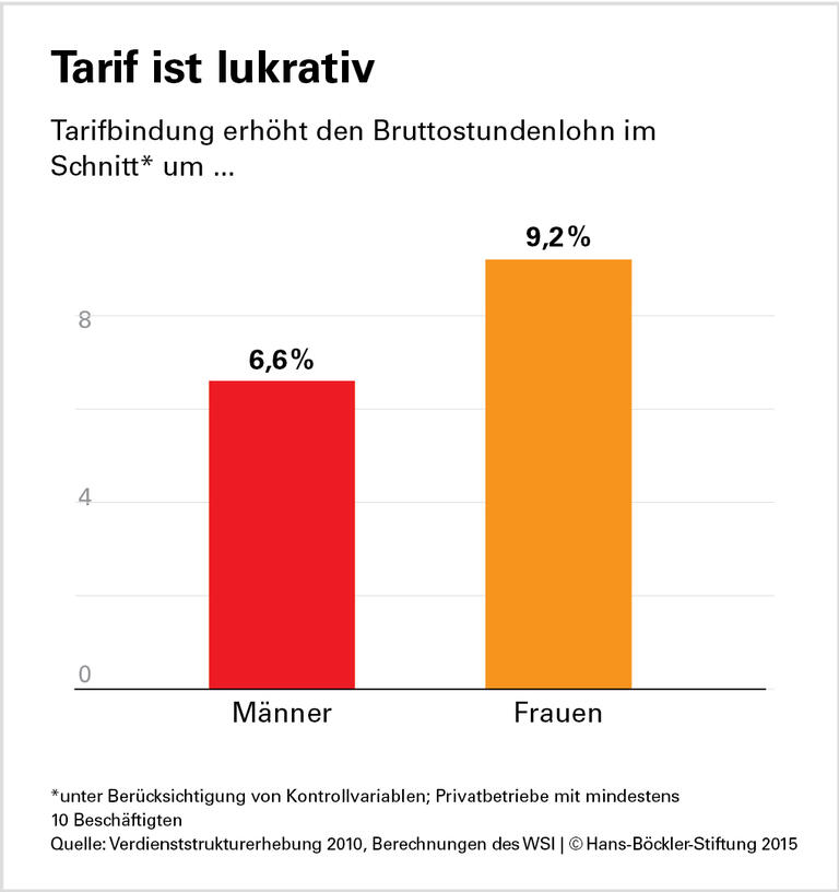 In Branchen mit hohem Frauenanteil und geringer Tarifbindung fällt der Tarifvorteil sogar noch höher aus. Im Einzelhandel beträgt er beispielsweise 17,3 Prozent.