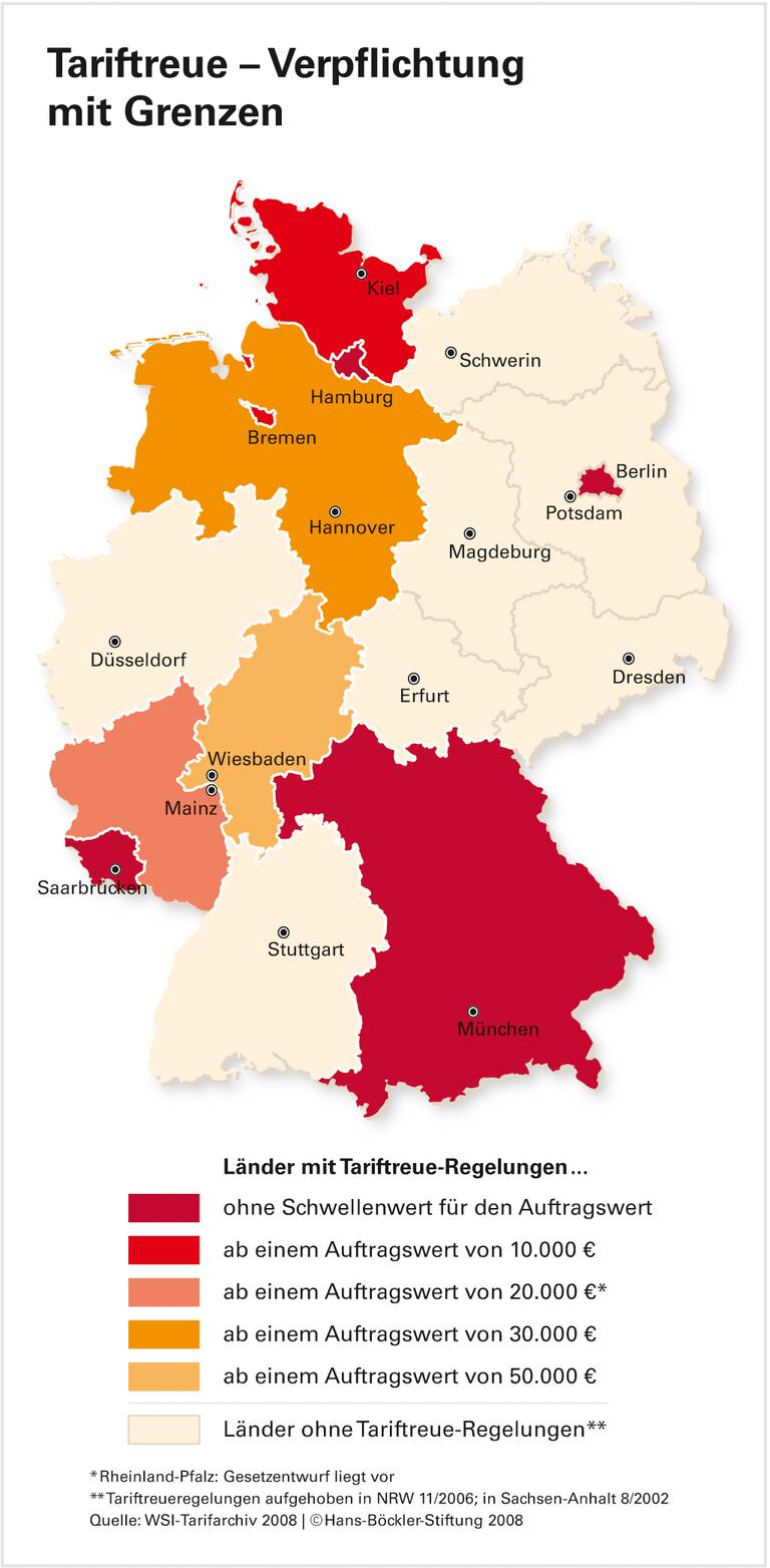 Die meisten westdeutschen Bundesländer, SPD- wie unionsregierte, haben in den vergangenen Jahren Tariftreuegesetze eingeführt. Auf Berlin, das 1999 den Anfang machte, folgten zwischen 2000 und 2004 Bayern, das Saarland, Niedersachsen, Bremen, Schleswig-Holstein und Hamburg. Im Dezember 2007 kam Hessen dazu. Rheinland-Pfalz hat für diesen Sommer ein entsprechendes Gesetz angekündigt, die Große Koalition in Mecklenburg-Vorpommern denkt darüber nach. Damit würde sich das West-Ost-Gefälle etwas abschwächen, das die Forscher bei den Tariftreuebestimmungen beobachten. Bislang hatte lediglich ein ostdeutsches Bundesland kurzzeitig eine Tariftreue-Vorschrift: Sachsen-Anhalt zwischen 2001 und 2002. Nach einem Regierungswechsel hob die neue CDU-FDP-Koalition die Regelung wieder auf. Das Gleiche passierte in Nordrhein-Westfalen, wo es von 2002 bis 2006 ein Tariftreuegesetz gab. Ein von der rot-grünen Bundesregierung 2002 vorgelegter Entwurf für ein bundesweit einheitliches Tariftreuegesetz scheiterte an der Ablehnung durch den von der Union dominierten Bundesrat.