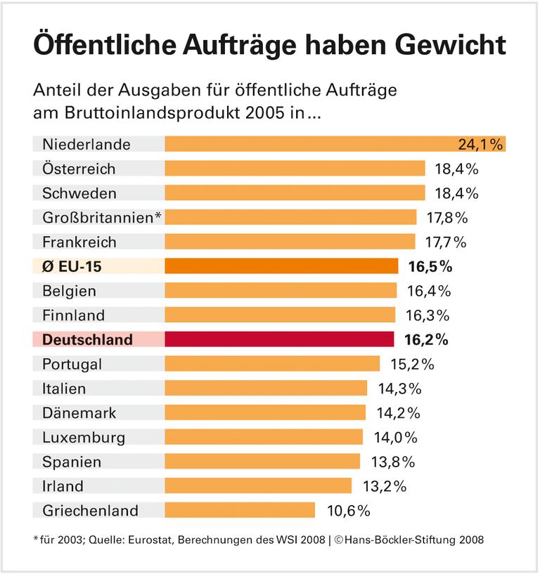 Mehr als 360 Milliarden Euro geben die etwa 30.000 Vergabestellen des Bundes, der Länder und der Kommunen jedes Jahr für öffentliche Aufträge aus. Damit bewegt die öffentliche Hand rund 16 Prozent des Bruttoinlandsproduktes. Als Einkäufer mit erheblicher Marktmacht beeinflusst der Staat Arbeitsbeziehungen und Tarifsystem zwangsläufig mit. Das zeigen Thorsten Schulten, WSI-Tarifexperte, und Michael Pawicki in einer neuen Untersuchung.* Denn Vergabeordnungen sind notwendigerweise relativ starr. Wenn sie - scheinbar neutral - lediglich auf den Preis einer Leistung abstellten, "würde der Staat selbst zur weiteren Erosion des Tarifvertragssystems beitragen, da er normalerweise gezwungen ist, das günstigste Angebot anzunehmen, und damit nicht-tarifgebundenen Unternehmen einen strukturellen Wettbewerbsvorteil einzuräumen", schreiben die beiden Autoren.
