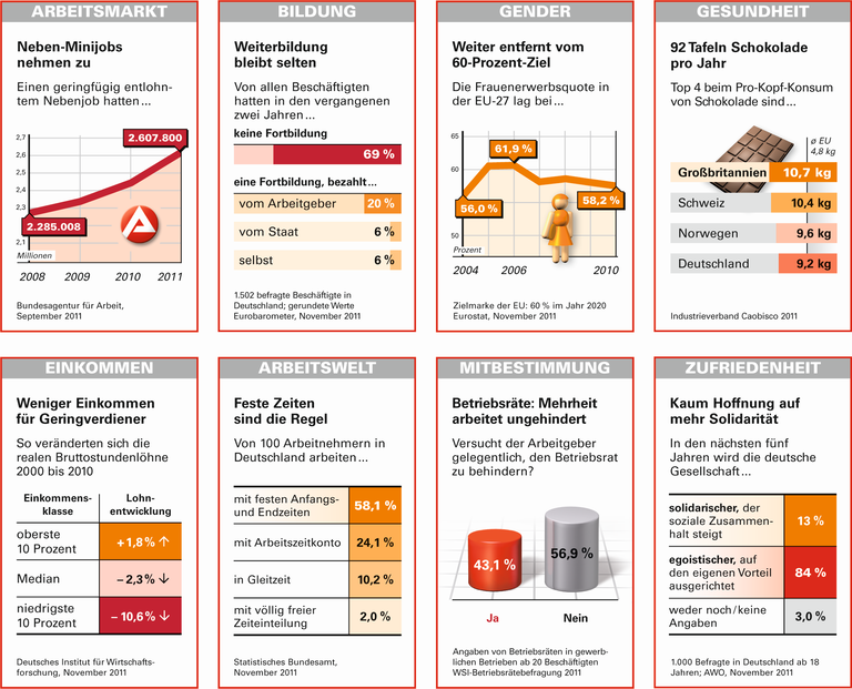 Die Ungleichheit in Deutschland hat sich in den vergangenen 15 Jahren deutlich verschärft. Nach Berechnungen der OECD verfügten die reichsten zehn Prozent der Bevölkerung im Jahr 2008 über Einkünfte, die achtmal so hoch waren wie die der ärmsten Bevölkerungsschicht. Mitte der 1990er-Jahre lag das Verhältnis noch bei sechs zu eins. Die wachsende Ungleichheit führt die OECD auf mehrere Faktoren zurück: Hochqualifizierte profitieren von stabilen Beschäftigungsverhältnissen und steigenden Einkommen, Geringqualifizierte finden immer weniger Arbeit. Auch die Zunahme der Teilzeitarbeit und die wachsende Bedeutung von Kapitaleinkünften für die Einkommen von Besserverdienern tragen laut OECD zur Polarisierung bei. Zudem verteile das Steuer- und Sozialsystem weniger um.