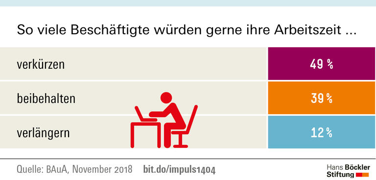 Wenn Beschäftigte über ihre wöchentliche Arbeitszeit selbst entscheiden könnten, würden sie im Schnitt eine 35-Stunden-Woche wählen, auch wenn sie dadurch weniger verdienen. Das zeigt eine Auswertung der Bundesanstalt für Arbeitsschutz und Arbeitsmedizin. Die gewünschte Arbeitszeit liegt demnach im Schnitt vier Stunden unter der tatsächlichen. Länger arbeiten wollen insbesondere Beschäftigte in Teilzeit. Drei von zehn Teilzeitbeschäftigten äußern den Wunsch nach mehr Wochenstunden – sie möchten im Durchschnitt zehn Stunden länger arbeiten.