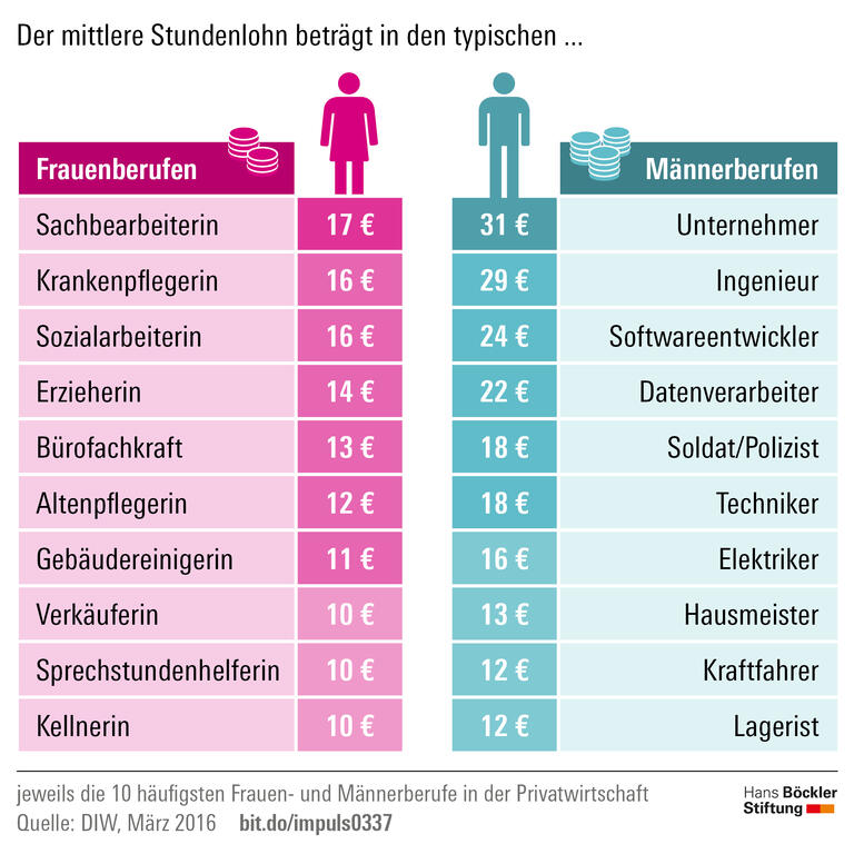 In Berufen mit über 70 Prozent Frauenanteil bekommen die Beschäftigten im Schnitt einen Stundenlohn von 12 Euro, in typischen Männerberufen sind es 20 Euro. Das zeigt eine Studie des Deutschen Instituts für Wirtschaftsforschung (DIW). Die Lohndifferenz beträgt damit gut 40 Prozent. Mit einem höheren Akademisierungsgrad in typischen Männerberufen ließen sich die Unterschiede allein nicht erklären, so das DIW. Ein weiterer Faktor sei, dass männlich konnotierte Tätigkeiten gesellschaftlich eine höhere Wertschätzung erfahren als weibliche.