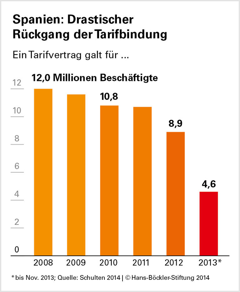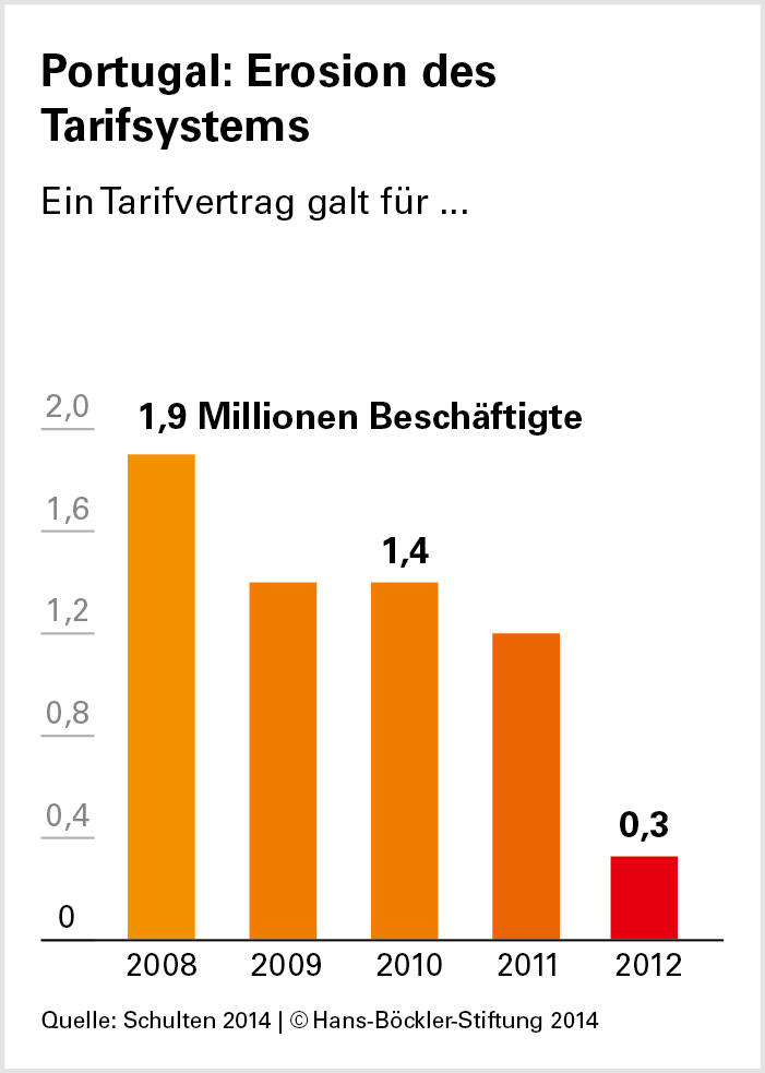 In Griechenland gab es 2010 noch 65 Flächentarifverträge, heute sind es nur noch 14. Die Zahl der betrieblichen Lohnvereinbarungen ist dagegen in die Höhe geschossen – 80 Prozent davon führten zu einer Kappung der Verdienste. In Portugal arbeiten statt 1,9 Millionen heute nur noch knapp 330.000 Beschäftigte mit Flächentarifvertrag. In Spanien ging die Zahl von 12,0 Millionen auf 4,6 Millionen zurück.