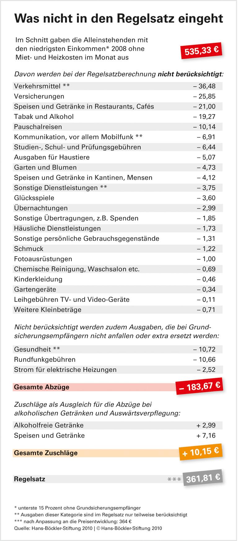 Ein wenig transparentes Verfahren. Das Bundesverfassungsgericht hält das derzeit angewandte Statistikverfahren zwar nicht für ungeeignet, um das Existenzminimum festzustellen. Es hat den Gesetzgeber allerdings aufgefordert, darauf zu achten, dass Haushalte, deren Nettoeinkommen unter Hartz-IV-Niveau liegt, "aus der Referenzgruppe ausgeschieden werden". Zwar sind nun alle Haushalte, die vollständig auf Grundsicherungsleistungen angewiesen sind, aus der Referenzgruppe entfernt worden. Die Aufstocker und vor allem die Gruppe der "versteckten Armen" sind jedoch noch enthalten - was zu einer Senkung des Leistungsniveaus führt.