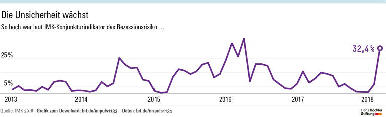 Rechnerisch beruht der Ausschlag des Konjunkturindikators dem IMK zufolge auf einem merklichen Rückgang der Industrieproduktion sowie auf einer weiteren Verschlechterung von Stimmungsindikatoren. Hinzu kämen Irritationen an den Finanzmärkten, die zu einem Großteil auf den Konfrontationskurs der USA in der Handelspolitik zurückzuführen sind. „Präsident Trumps Flirt mit dem Protektionismus sendet Schockwellen aus, die über die Finanzmärkte auch die deutsche Wirtschaft treffen. Noch bevor klar ist, ob die amerikanischen Strafzölle auch auf europäische Waren ausgedehnt werden, breitet sich starke Verunsicherung aus“, erklärt IMK-Direktor Gustav Horn. Der Anstieg des Rezessionsrisikos wäre sogar noch stärker ausgefallen, wenn Unternehmen nicht weiterhin so günstig an Kredite kämen.