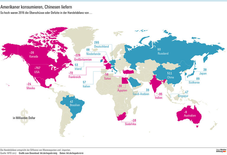 Welche Druckmittel hat Trump in der Hand? Die USA haben ein riesiges Handelsbilanzdefizit angehäuft, sie importieren weit mehr, als sie exportieren. Im Jahr 2016 lag das Defizit im Handel mit Waren bei fast 800 Milliarden Dollar. Allein gegenüber Deutschland, dem Trump vorwirft, es manipuliere den Euro, um günstiger exportieren zu können, entstand ein Defizit von mehr als 60 Milliarden Dollar. Das stelle nicht zwangsläufig ein Zeichen von Schwäche dar, erklären die Wissenschaftler. Denn hinter den großen Mengen, die die Amerikaner importieren, stecke eben auch eine immense Kaufkraft. Länder wie China, Deutschland oder Mexiko seien darauf angewiesen, dass Amerikaner ihre Produkte kaufen. Mit der Drohung, den Zugang zum US-Markt zu beschränken, sorge Trump zuerst für Nervosität unter den Handelspartnern, um sie anschließend in Verhandlungen gefügig zu machen. „Mit dem größten Markt und dem höchsten Handelsbilanzdefizit sind die USA in einer starken Position gegenüber anderen Nationen“, schreiben die Experten. Nur die Europäische Union könne dem etwas entgegen setzen – aus diesem Grund verhandele Trump lieber mit den einzelnen Mitgliedstaaten als mit der EU.