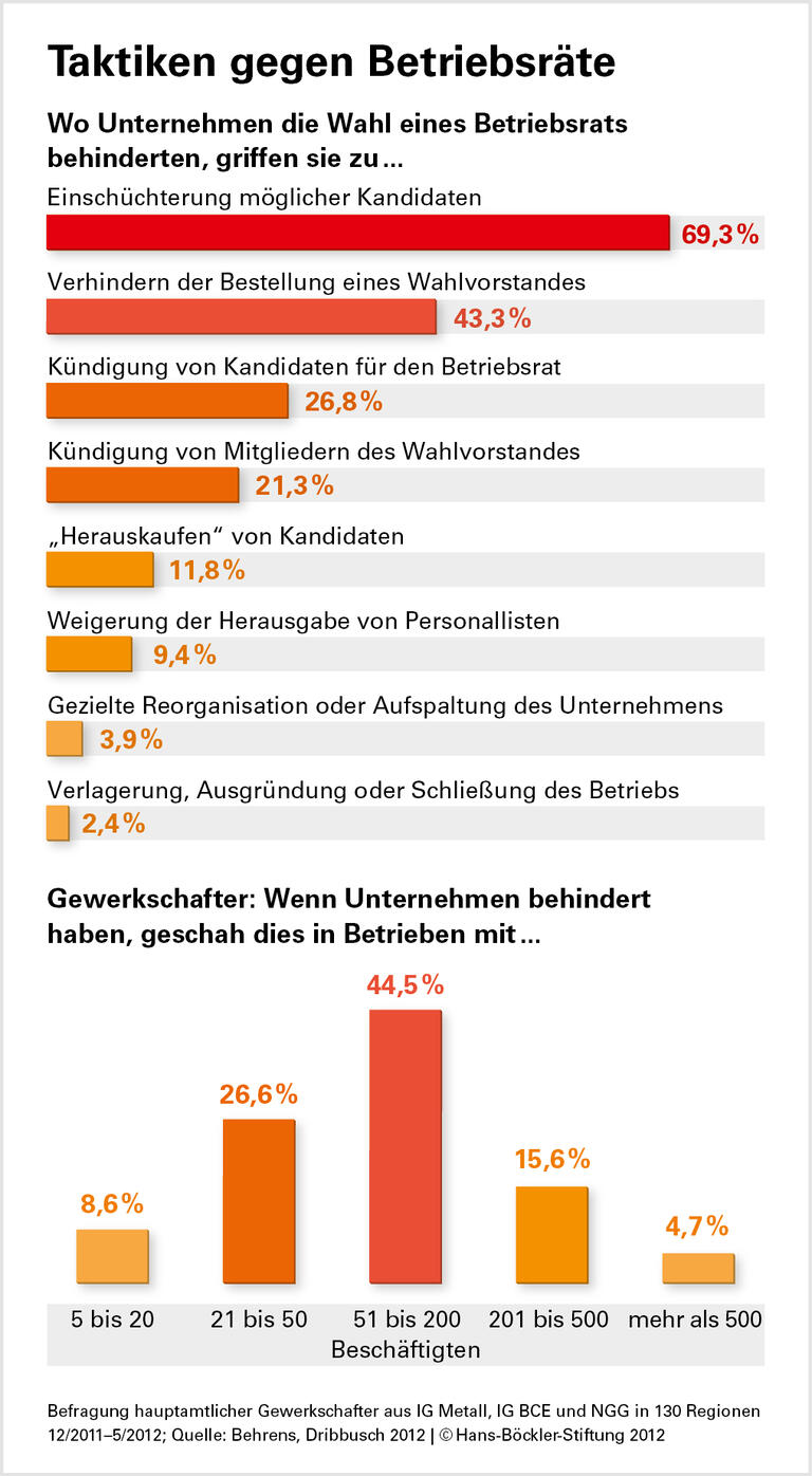 Gut ein Drittel der Gewerkschafter kennt Betriebe, in denen bereits existierende Betriebsräte vom Management behindert würden. Mitglieder des Betriebsrats werden gekündigt oder zum Rücktritt gedrängt. Eher selten ist die Aufspaltung des Unternehmens oder die Verlagerung respektive Schließung des betreffenden Betriebs zur Verhinderung von Mitbestimmung.