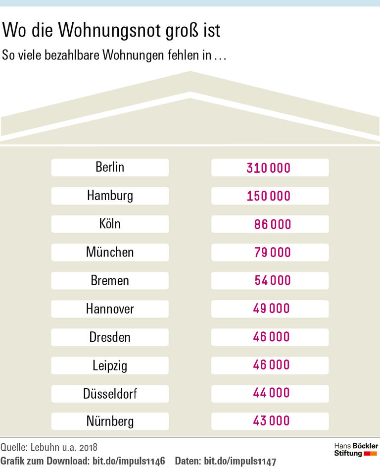 Die meisten bezahlbaren Wohnungen fehlen in Berlin mit rund 310 000. Es folgen Hamburg mit einer Lücke von 150 000, Köln mit 86 000 und München mit 79 000 Wohnungen. Doch selbst in Großstädten mit relativ kleinen „Versorgungslücken“ wie Moers, Wolfsburg, Koblenz oder Ulm überschreitet der Bedarf an günstigen Wohnungen das Angebot jeweils um mehrere Tausend.