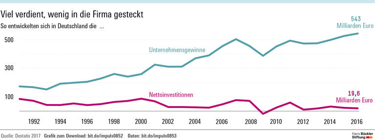 Die Gewinne von heute sind die Investitionen morgen. Dieser Satz stammt eigentlich von Helmut Schmidt. Unter der Regierung Kohl wurde er Anfang der 1980er-Jahre zum wirtschaftspolitischen Credo. Das Problem: Der behauptete Zusammenhang erweist sich in der Praxis als Schimäre. Damals wie heute. In den vergangenen zweieinhalb Jahrzehnten stiegen die Gewinne der Unternehmen relativ kontinuierlich, ihre Nettoinvestitionen gingen im selben Zeitraum zurück. Darauf macht IMK-Forscher Fabian Lindner aufmerksam. Zuletzt entsprachen die Nettoinvestitionen nur knapp vier Prozent der Gewinne. 1991 waren es noch 50 Prozent.