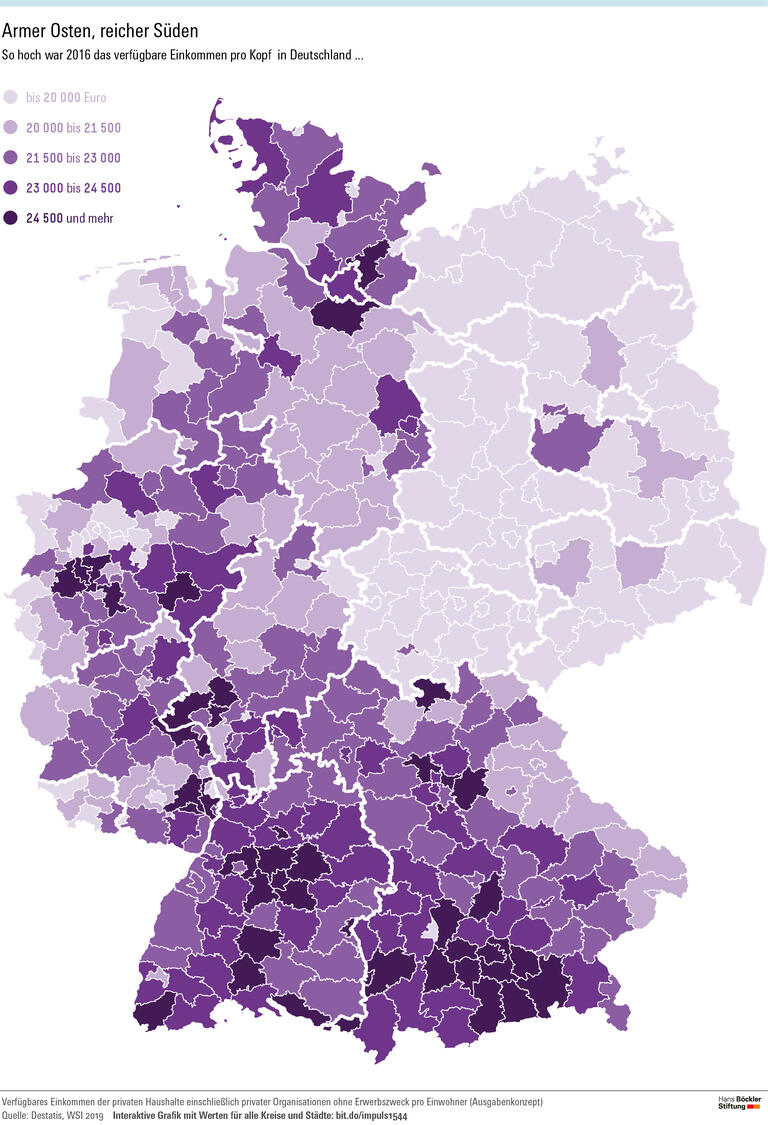 Einheitliche Lebensverhältnisse in der gesamten Bundesrepublik zu erreichen – diesen Auftrag erteilt das Grundgesetz der Politik seit fast 70 Jahren. Wie schwer er einzulösen ist, zeigt ein Blick auf die durchschnittlichen verfügbaren Einkommen in den 401 deutschen Landkreisen und kreisfreien Städten: Sie sind im Landkreis Starnberg bei München mit 34 987 Euro pro Person mehr als doppelt so hoch wie in der Stadt Gelsenkirchen mit 16 203 Euro. Neben Teilen des Ruhrgebiets, des Saarlands und Niedersachsens liegt vor allem Ostdeutschland weiterhin zurück: In nur sechs von 77 ostdeutschen Kreisen und kreisfreien Städten überschreitet das Einkommen die Marke von 20 000 Euro pro Kopf, während im Westen 284 von 324 Kreisen und Städten darüber liegen. Zu diesen Ergebnissen kommt eine Untersuchung des WSI.