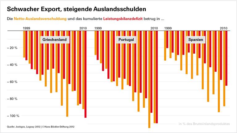 Viele Euroländer gerieten hingegen gegenüber der Bundesrepublik immer tiefer ins Minus. Spiegelbildlich zu den insgesamt steigenden Leistungsbilanzüberschüssen Deutschlands bauten die Südeuropäer Leistungsbilanzdefizite auf: Sie kauften mehr deutsche Waren und Dienstleistungen, als sie nach Deutschland exportieren konnten. Ihre Einkäufe mussten sie über Kredite aus dem Ausland finanzieren. Permanente Leistungsbilanzdefizite führten so in Ländern wie Portugal oder Italien zu stetiger Nettokreditaufnahme und damit zunehmender Nettoverschuldung gegenüber Staaten wie Deutschland. Ausländische Gläubiger sind bei einem derart steigenden Schuldenstand immer weniger geneigt, den Haushalten, Unternehmen oder der Regierung eines Defizitlandes weitere Kredite zu geben; vor allem, wenn in der Zukunft ebenfalls keine Korrekturen der Leistungsbilanz zu erwarten sind. Sichtbares Zeichen dafür: steigende Risikoprämien, also höhere Zinsen.