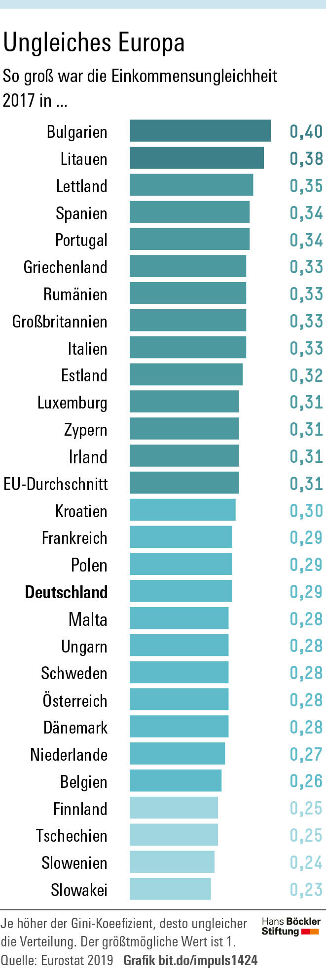 Im europäischen Vergleich liegt Deutschland bei der Einkommensungleichheit knapp unter dem EU-Durchschnitt. Größer ist die Ungleichheit der verfügbaren Haushaltseinkommen in Süd- und Osteuropa, geringer in den meisten nordeuropäischen Ländern.