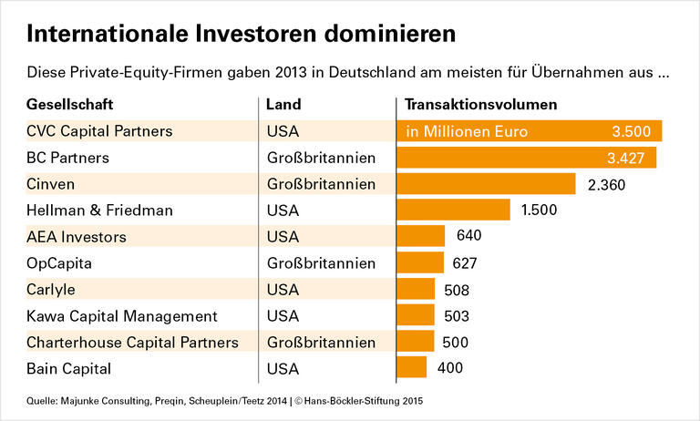 Private-Equity-Gesellschaften kauften 2013 insgesamt 191 Unternehmen mit Sitz in Deutschland. Diese Unternehmen wiesen einen Umsatz von 16,5 Milliarden Euro aus und beschäftigten 117.000 Arbeitnehmer.