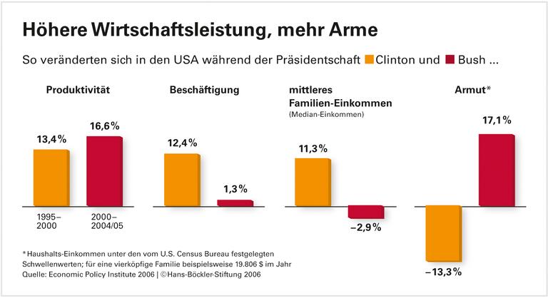 Zwischen 2000 und 2005 ist die Produktivität der US-amerikanischen Wirtschaft jährlich um 3,1 Prozent gestiegen. Gleichzeitig ist das reale mittlere Familieneinkommen von 2000 bis 2004 um 3 Prozent zurückgegangen.
