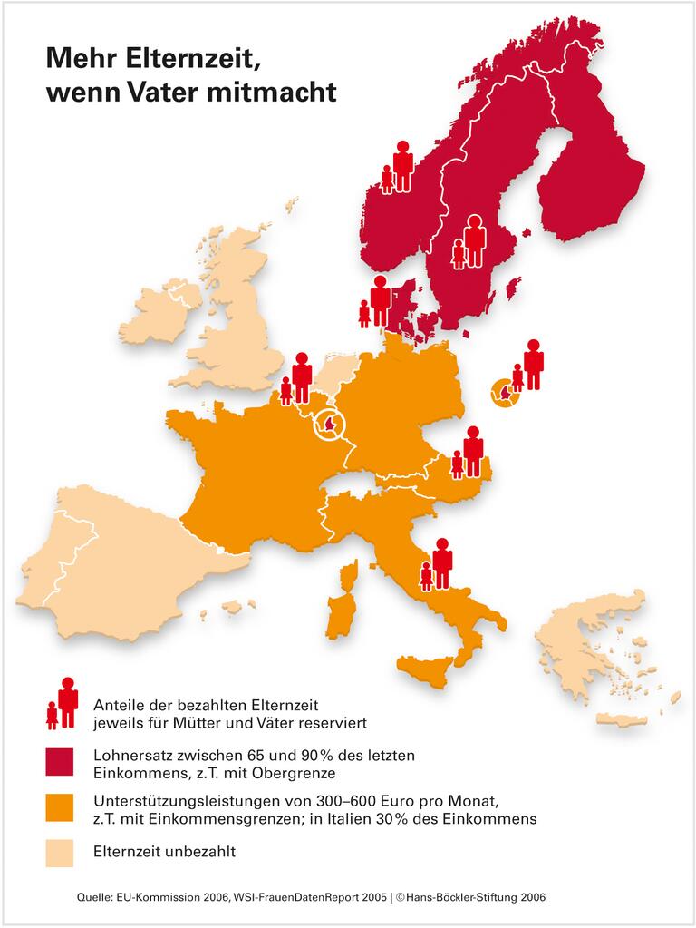 Beides ist sinnvoll, betont WSI-Expertin Christina Klenner: "Das Elterngeld setzt das richtige Signal, indem es auf einen kürzeren Ausstieg aus dem Berufsleben und die Teilung der Elternverantwortung mit dem Vater orientiert." Daten der EU-Kommission zeigen, dass die Botschaft wenigstens teilweise auch bei den Männern ankommt. So nehmen in Finnland und Dänemark knapp zehn Prozent der Väter Elternzeit, in Schweden, wo faktisch zwei Monate für den Vater reserviert sind, sogar jeder Dritte. In Deutschland sind es dagegen fünf Prozent. Und überdurchschnittlich viele deutsche Väter gaben in einer europäischen Vergleichsstudie an, sie könnten es sich finanziell nicht leisten, ihre Berufstätigkeit zu unterbrechen.