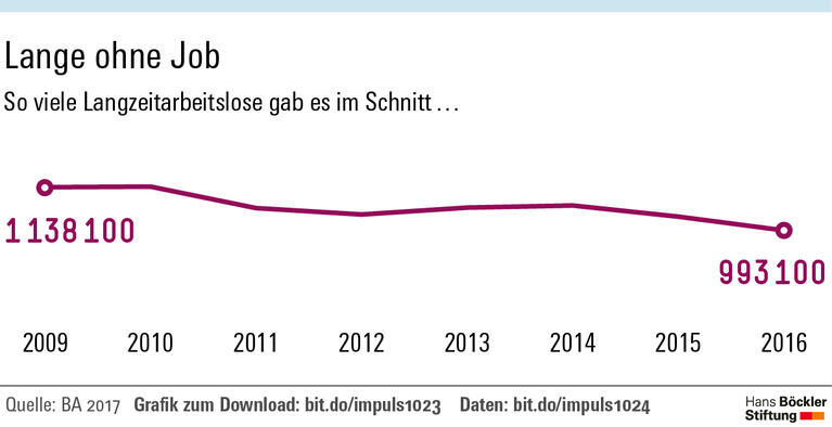 Am deutschen Arbeitsmarkt läuft scheinbar alles rund. Die Zahl der Erwerbstätigen hat zuletzt mit 44,5 Millionen einen neuen Rekord erreicht, die Arbeitslosenquote betrug Ende 2017 nur 5,3 Prozent. Es gibt aber auch Schattenseiten: Die Zahl der Langzeitarbeitslosen stagniert seit Jahren bei rund einer Million. Das geht aus einem Bericht des von der Hans-Böckler-Stiftung geförderten Arbeitskreises Arbeitsmarktpolitik hervor, den Matthias Knuth vom Institut Arbeit und Qualifikation der Universität Duisburg-Essen herausgegeben hat. Die Teilnehmer – Experten aus Wissenschaft, Verwaltung, Gewerkschaften und Verbänden – haben Vorschläge für eine solidarische und vorausschauende Arbeitsmarktpolitik entwickelt.