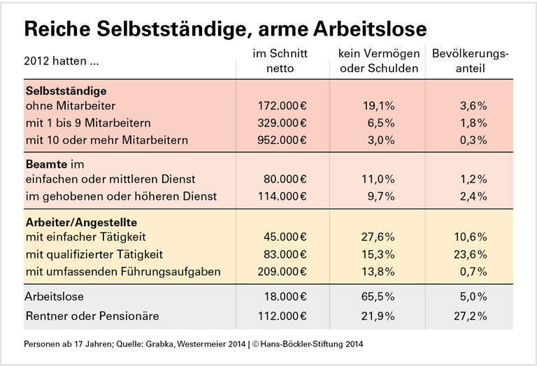 Beim privaten Reichtum gibt es laut der DIW-Studie zum Teil erhebliche Differenzen zwischen West und Ost, Männern und Frauen, Unternehmern und Beschäftigten. So war das durchschnittliche Nettovermögen der Westdeutschen 2012 mit 94.000 Euro mehr als doppelt so hoch wie das der Ostdeutschen, die nur auf 41.000 Euro kamen. Männer besaßen im Schnitt 97.000 Euro, Frauen 27.000 weniger. Azubis und Praktikanten verfügten durchschnittlich über 8.000, einfache Angestellte über 45.000 und Meister sowie qualifizierte Angestellte und Beamte im einfachen und mittleren Dienst über rund 80.000 Euro. Angestellte mit umfassenden Führungsaufgaben kamen netto auf über 209.000 Euro. Selbstständige ohne Mitarbeiter besaßen 172.000, Unternehmer mit mehr als zehn Mitarbeitern knapp eine Million Euro.