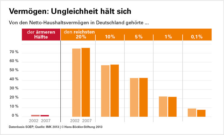 Mit der Frage nach den Ursachen und Konsequenzen der Ungleichheit ökonomischer Ressourcen in Deutschland, hat sich auch Kai Daniel Schmid beschäftigt. Der Wissenschaftler hat zusammen mit seinen Kollegen den IMK Verteilungsmonitor entwickelt.* Dazu haben sie Daten des Sozio-oekonomischen Panels ausgewertet. Damit lassen sich auch Aussagen über die Entwicklung der Einkommens- und Vermögensverteilung treffen. „Generell scheint die hohe Vermögenskonzentration die Einkommensungleichheit zu verfestigen“, so Schmid. Und: Je höher das Vermögen eines Haushalts im Jahr 2002 war, desto größer die Wahrscheinlichkeit, dass es fünf Jahre später immer noch relativ hoch ist.