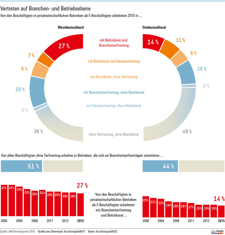 Nach der jüngsten Erhebung des Instituts für Arbeitsmarkt- und Berufsforschung sind das in Westdeutschland 27 und in Ostdeutschland 14 Prozent der Arbeitnehmer in privatwirtschaftlichen Betrieben ab 5 Beschäftigten. Außerdem haben 7 beziehungsweise 11 Prozent einen Haustarifvertrag und einen Betriebsrat, der sich für sie einsetzt.
