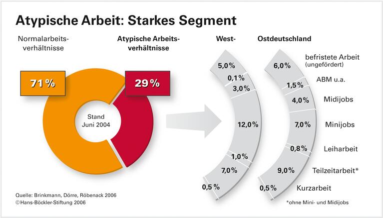 - Die "normalen" Erwerbstätigen haben Angst vor Arbeitslosigkeit und sozialem Abstieg. Denn sie erleben in ihrem Umfeld, dass sie durch Externe ersetzbar sind und rasch überflüssig werden können. Die Sorge wird noch verschärft, seit der Sozialstaat mit der so genannten Hartz-IV-Reform den Arbeitslosen nicht mehr den Status sichert, sondern nur noch die Existenz.