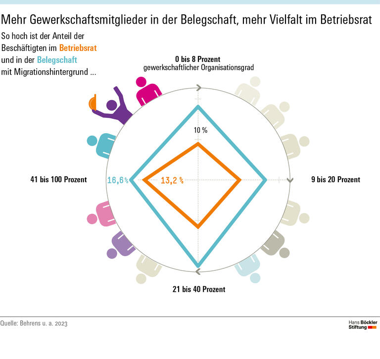 Was eine angemessene Repräsentation Beschäftigter mit Migrationshintergrund begünstigt, haben Behrens, Bremer und Pohlmeyer mit statistischen Methoden zu ergründen versucht. Dabei erwiesen sich Faktoren wie die Betriebsgröße, das Geschlechterverhältnis in der Belegschaft, die Branche oder die Verbreitung atypischer Beschäftigung als praktisch bedeutungslos. Wenig überraschend ist, dass Migrantinnen oder Migranten eher im Betriebsrat sitzen, wenn ihr Anteil an der Belegschaft hoch ist. Statistisch auffällig sind daneben zwei Dinge: Erstens verbessern sich die Chancen von Migrantinnen und Migranten dort, wo viele Angelernte arbeiten – vermutlich weil in solchen Bereichen viele Beschäftigte einen Migrationshintergrund haben und Kolleginnen oder Kollegen wählen, die sie aus ihrem unmittelbaren Arbeitsumfeld kennen. Zweitens: Ein hoher gewerkschaftlicher Organisationsgrad begünstigt einen vielfältigen Betriebsrat.