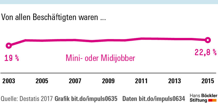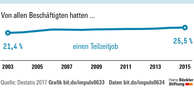 In Deutschland hat sich seit Beginn der 1990er-Jahre der Anteil der atypischen Beschäftigung an allen Jobs verdoppelt, ist zuletzt aber nicht weiter gewachsen. Wie im übrigen Europa sind derzeit vier von zehn Beschäftigten nicht mehr im Normalarbeitsverhältnis tätig. 90 Prozent von ihnen gelten als atypisch beschäftigt, weil sie als Teilzeitbeschäftigte, Mini- oder Midijobber weniger als 35 Stunden in der Woche arbeiten.