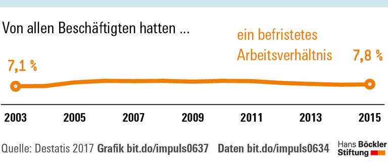 Statt an der Regulierung des Arbeitsmarkts könnte die Ausbreitung von Minijob & Co. natürlich ebenso an dessen Deregulierung liegen. Die begann schon mit dem Beschäftigungsförderungsgesetz von 1985 und erreichte ihren Höhepunkt mit den Hartz-Reformen kurz nach der Jahrtausendwende. Starke Indizien sprechen dafür, dass viele Unternehmen neu geschaffene Schlupflöcher sofort nutzen. So wurde die 1985 eingeführte sachgrundlose Befristung von Arbeitsverhältnissen 2003 noch einmal deutlich erleichtert – und die Zahl der neu abgeschlossenen befristeten Verträge stieg steil an. Allerdings, so Carina Sperber und Ulrich Walwei vom Institut für Arbeitsmarkt- und Berufsforschung, haben die Hartz-Reformen „nach 2005 – abgesehen von kurzfristigen Verstärkungen des Trends – keine dauerhafte Beschleunigung der Strukturveränderungen bei den Erwerbsformen“ bewirkt. Bemerkenswert sei, dass die reguläre Beschäftigung gegenüber atypischen Jobs in jüngster Zeit wieder aufgeholt habe.